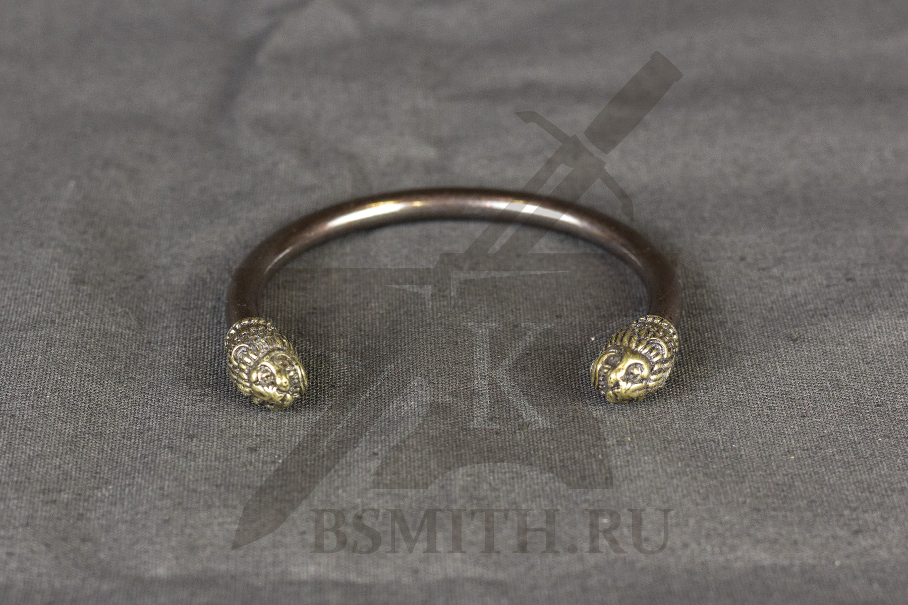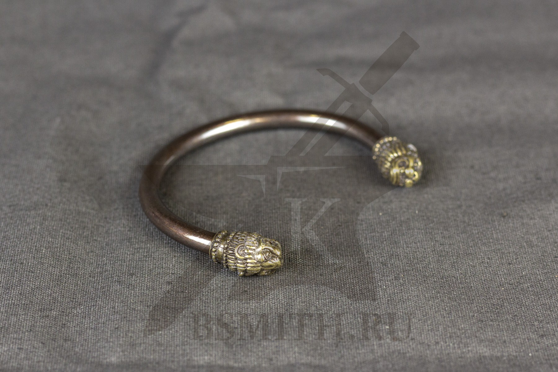 Жесткий браслет из толстого медного прутка круглого сечения, с латунными наконечниками в форме голов льва.