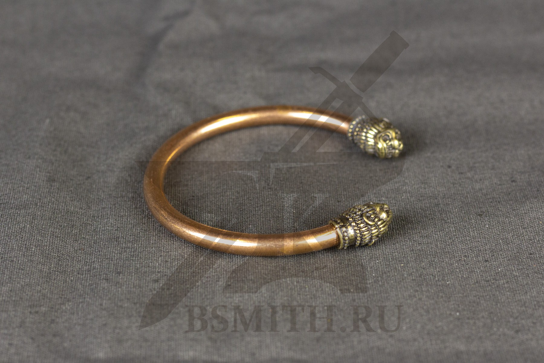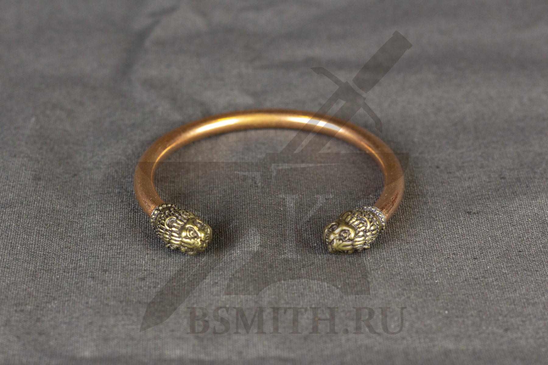 Жесткий браслет из толстого медного прутка круглого сечения, с латунными наконечниками в форме голов льва.