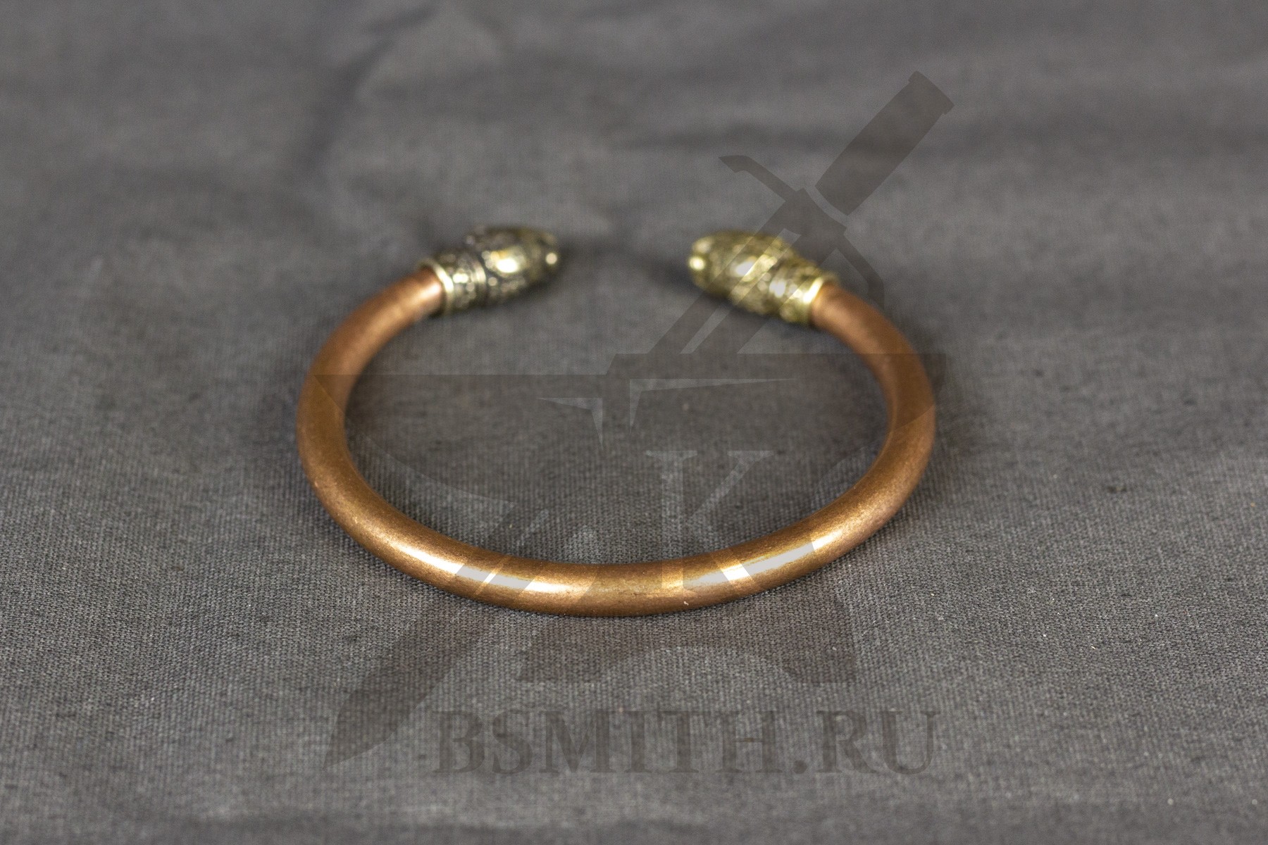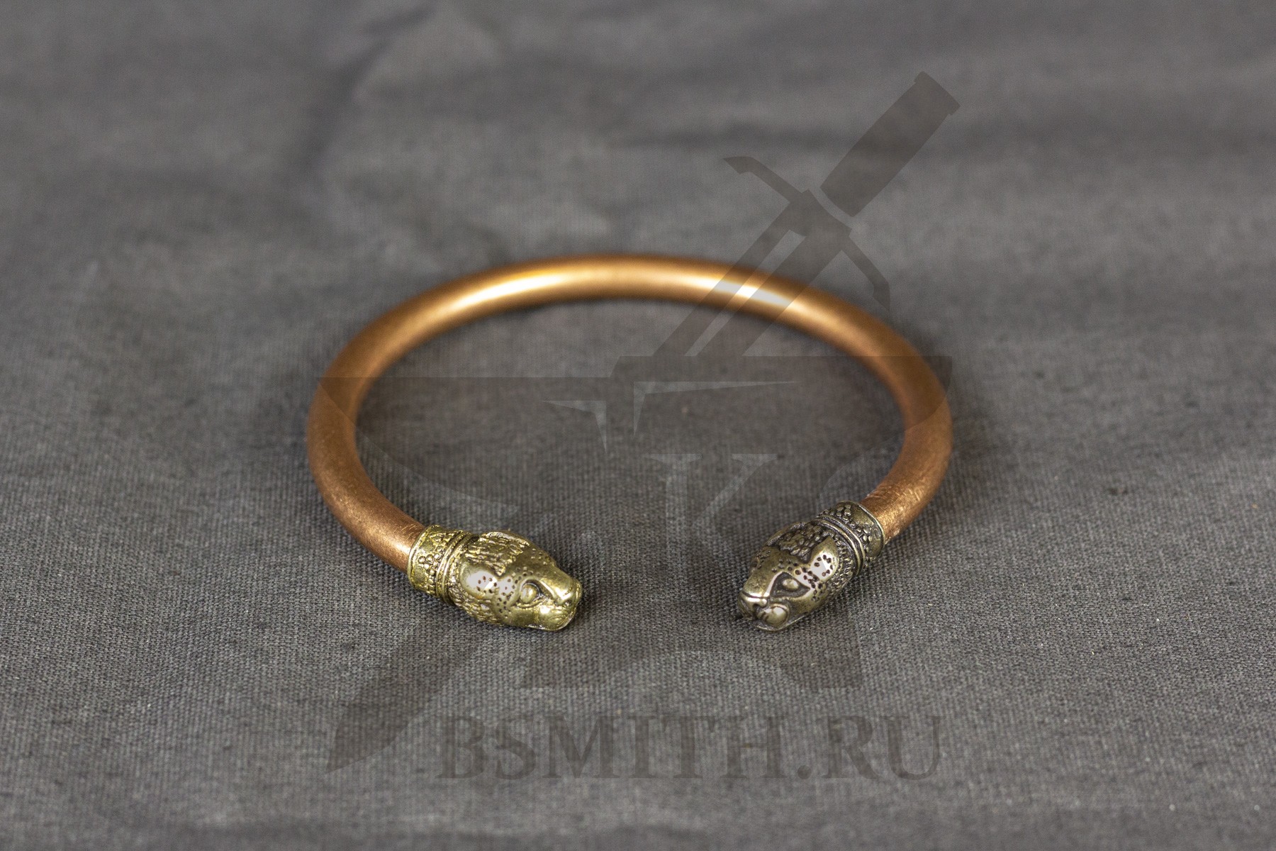 Жесткий браслет из толстого медного прутка круглого сечения, с латунными наконечниками в форме голов льва.