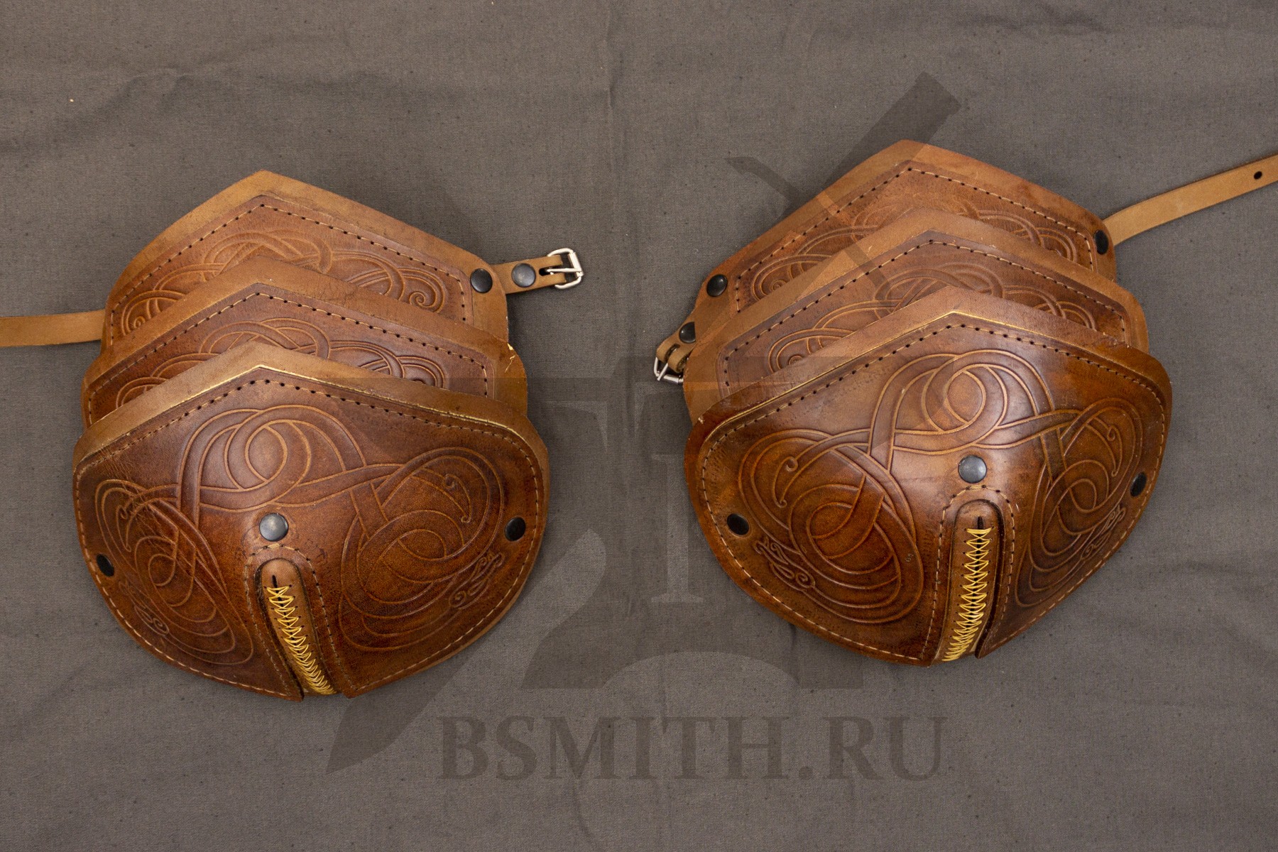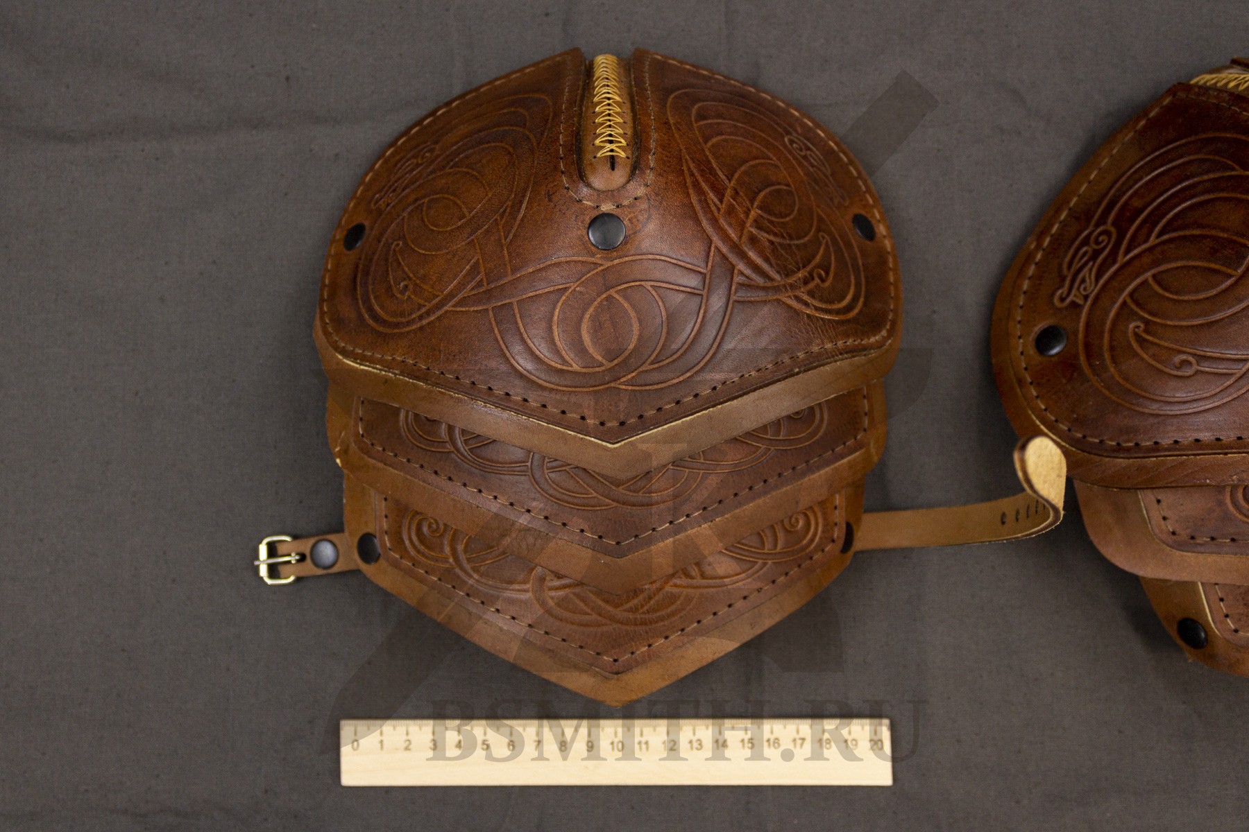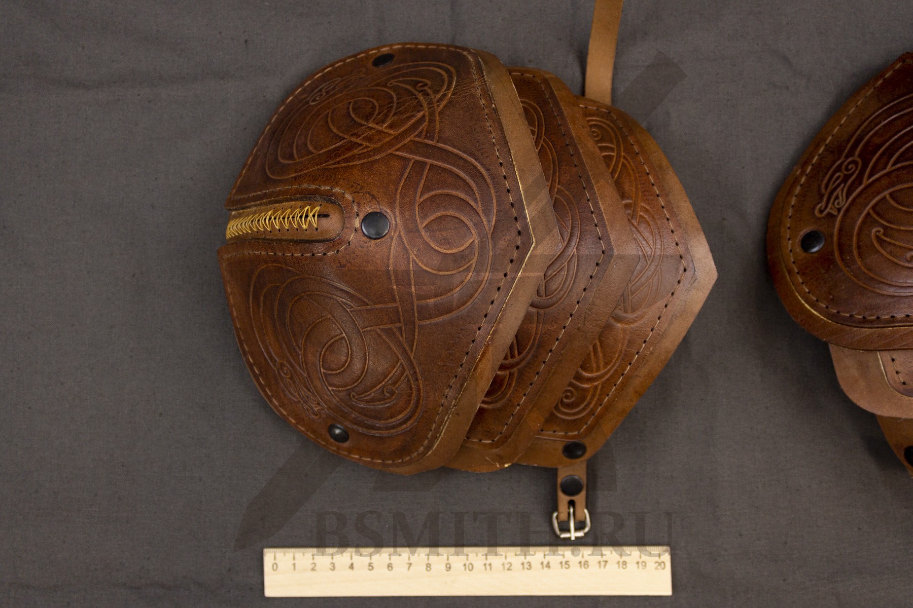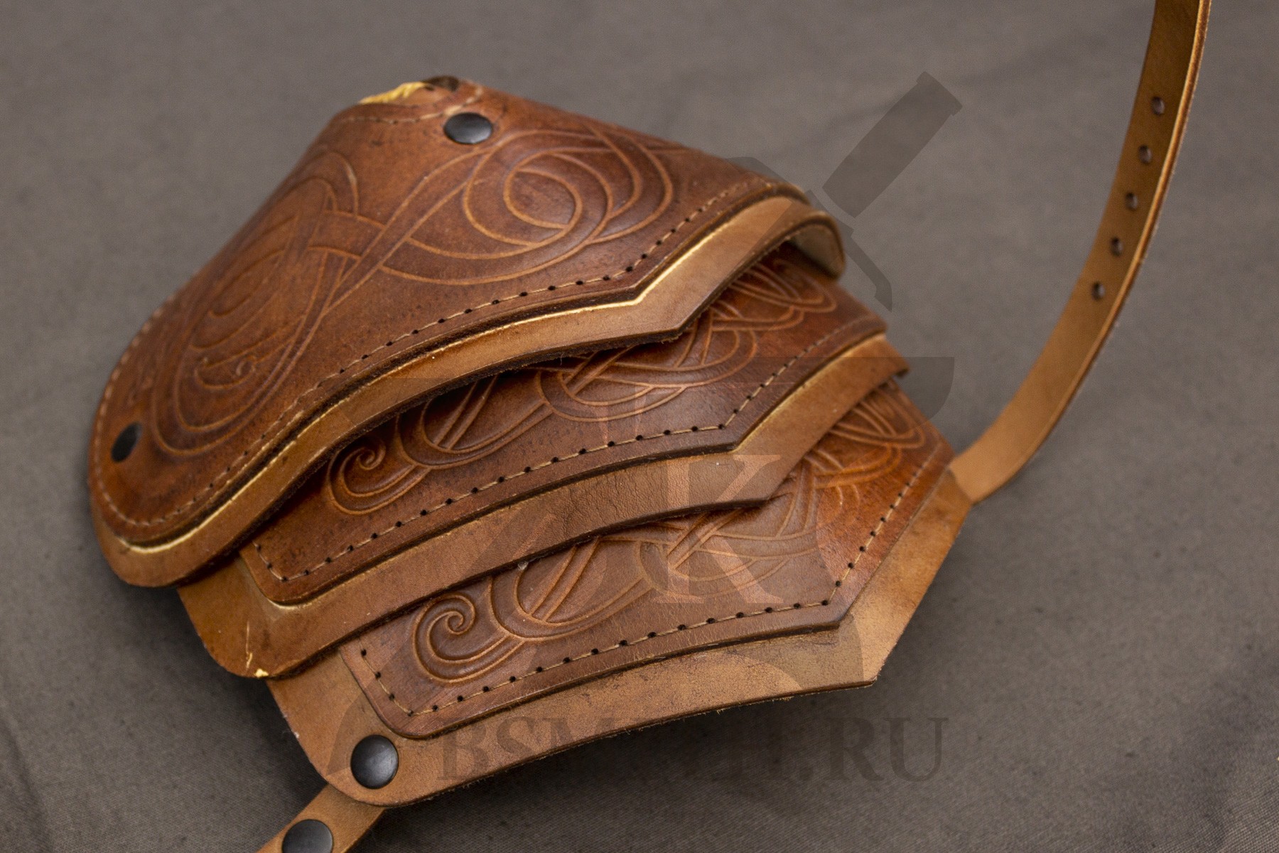 Наплечники из натуральной толстой кожи с тиснением и окраской, имеют орнамент, выполненный в скандинавском стиле.