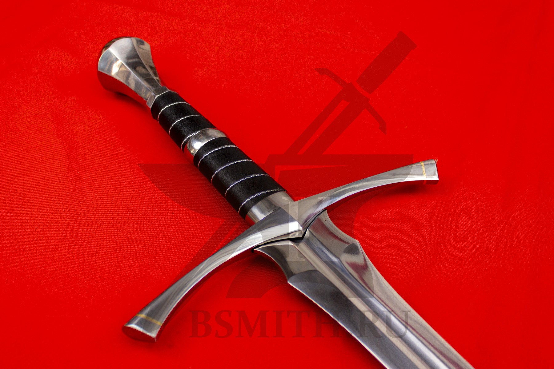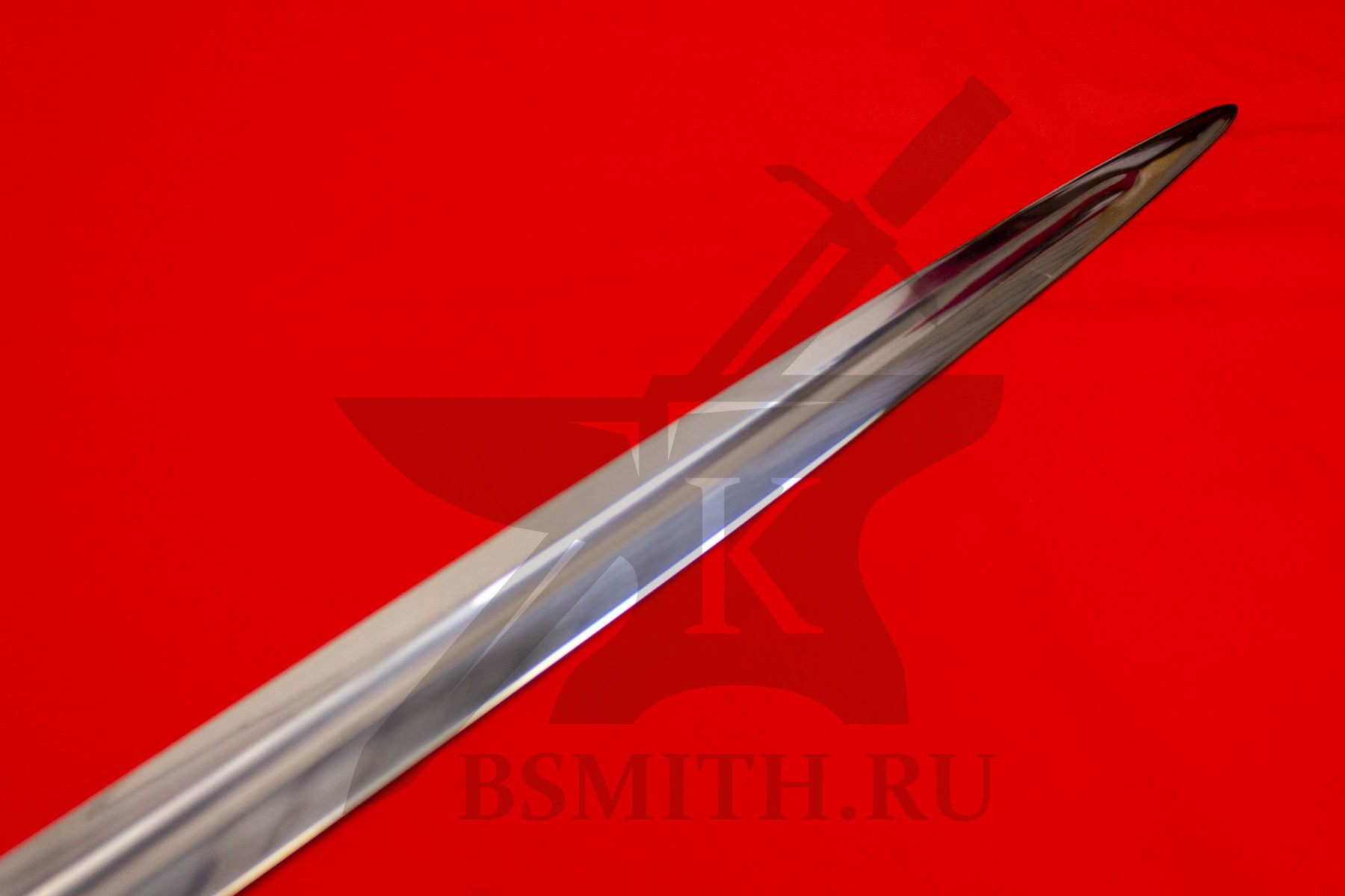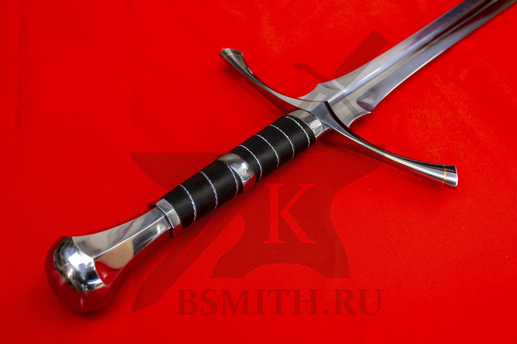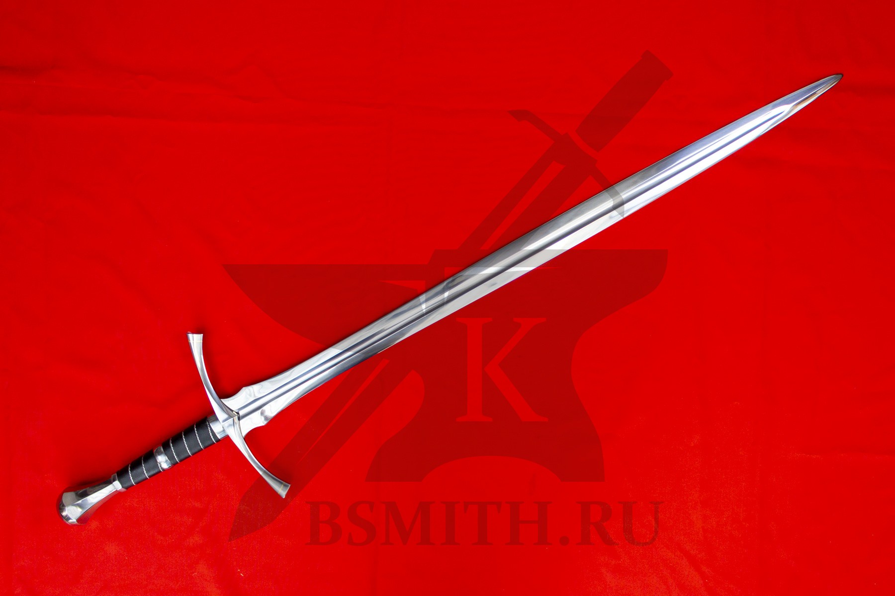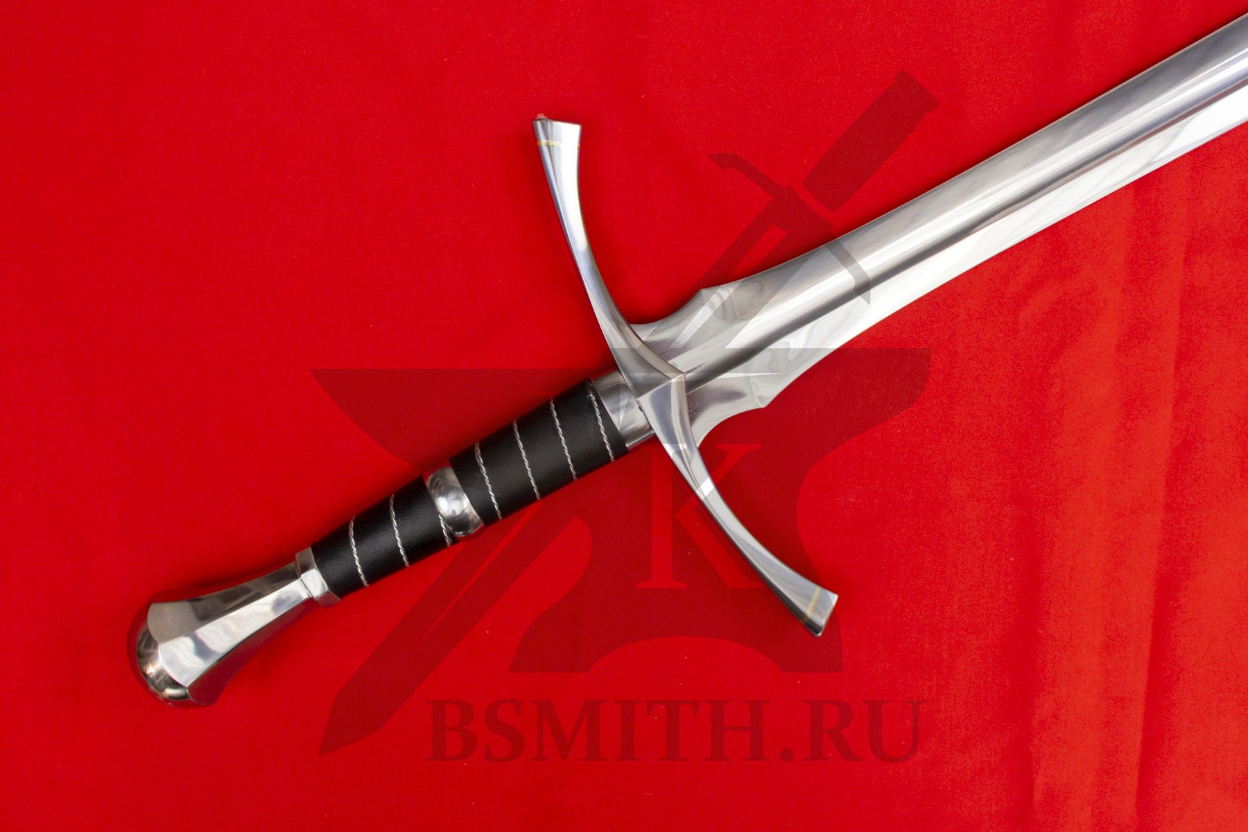 Клинок сделан из высокоуглеродистой легированной стали 65Г, с закалкой около 50 HRC, полированный. Клинок затуплен (отличие от холодного оружия), ослаблений никаких нет. Набор на эфес (навершие, гарда) стальной. Рукоять меча обмотана кожей и дополнительно стальной скрученной проволокой по шву кожи.