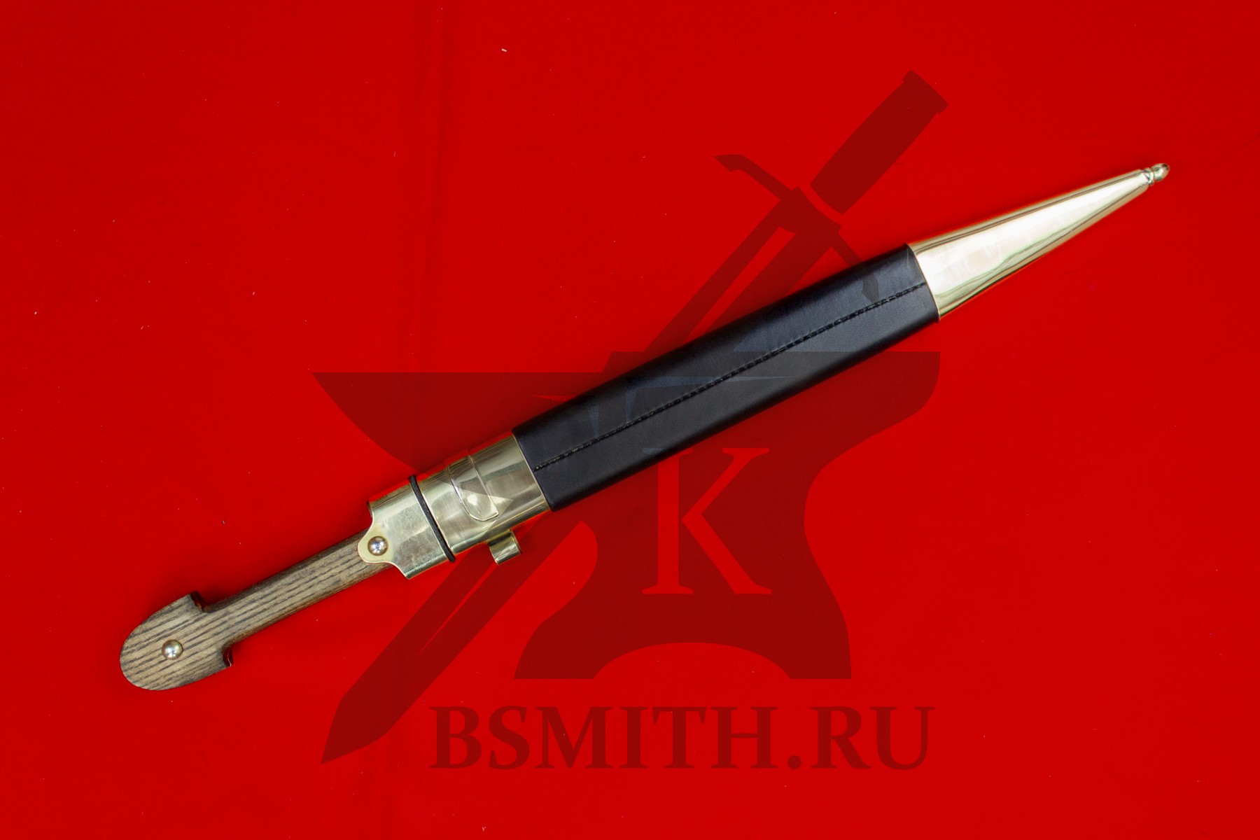 Ножны - дерево, обтянуты натуральной кожей, латунный гарнитур. Ножны входят в стоимость кинжала.