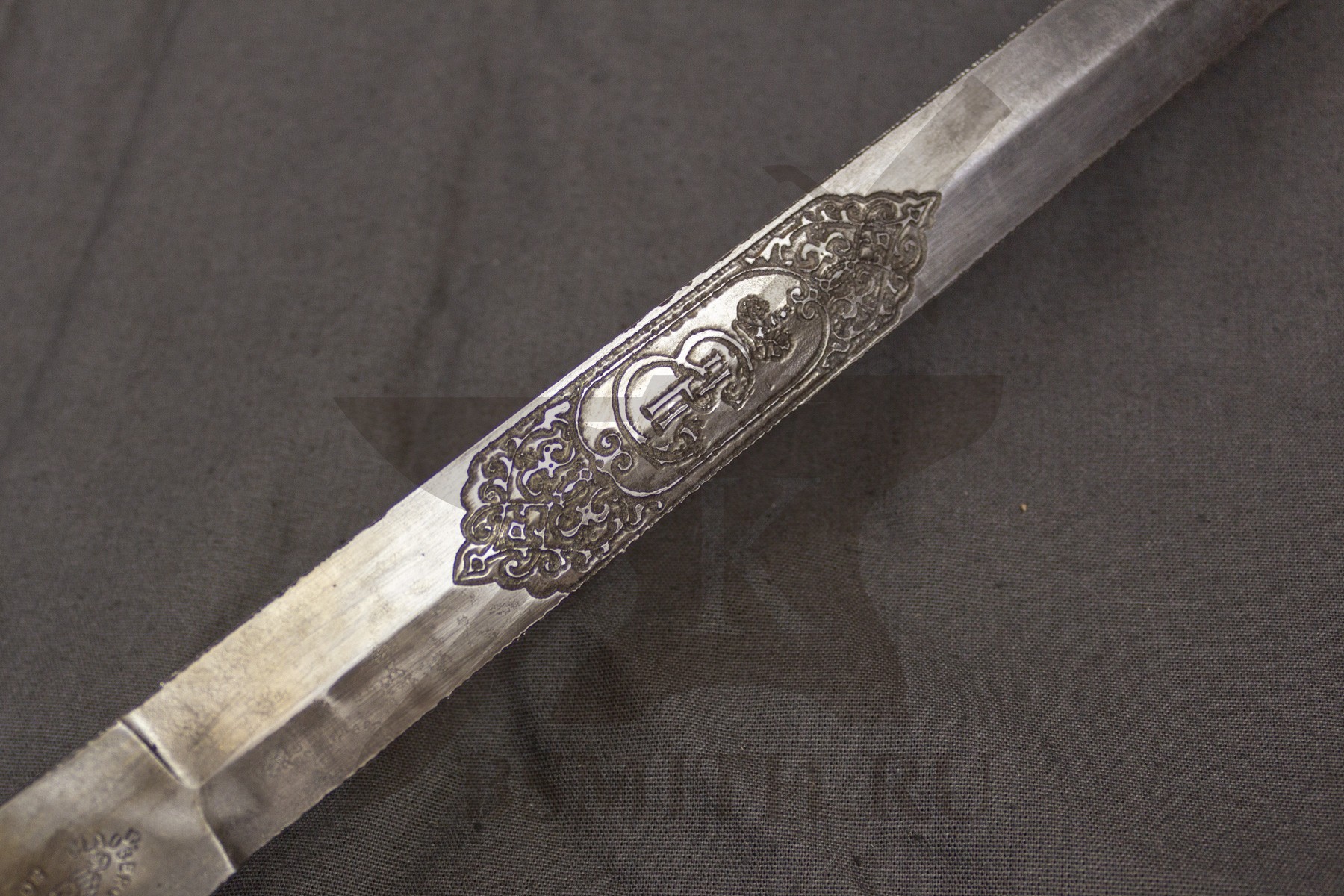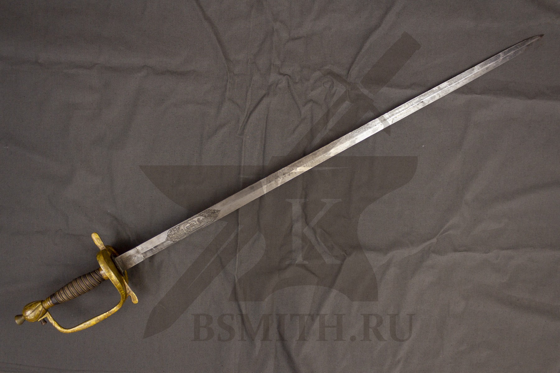 Шпага пехотная на основе модели шпаги офицерской Лейб-гвардии Преображенского полка, с состаренными клинком с имитацией небольших зарубок, кожей ножен и металлическими частями набора эфеса и ножен, и нанесенными клеймами. Также шпага имеет украшения клинка травлением.