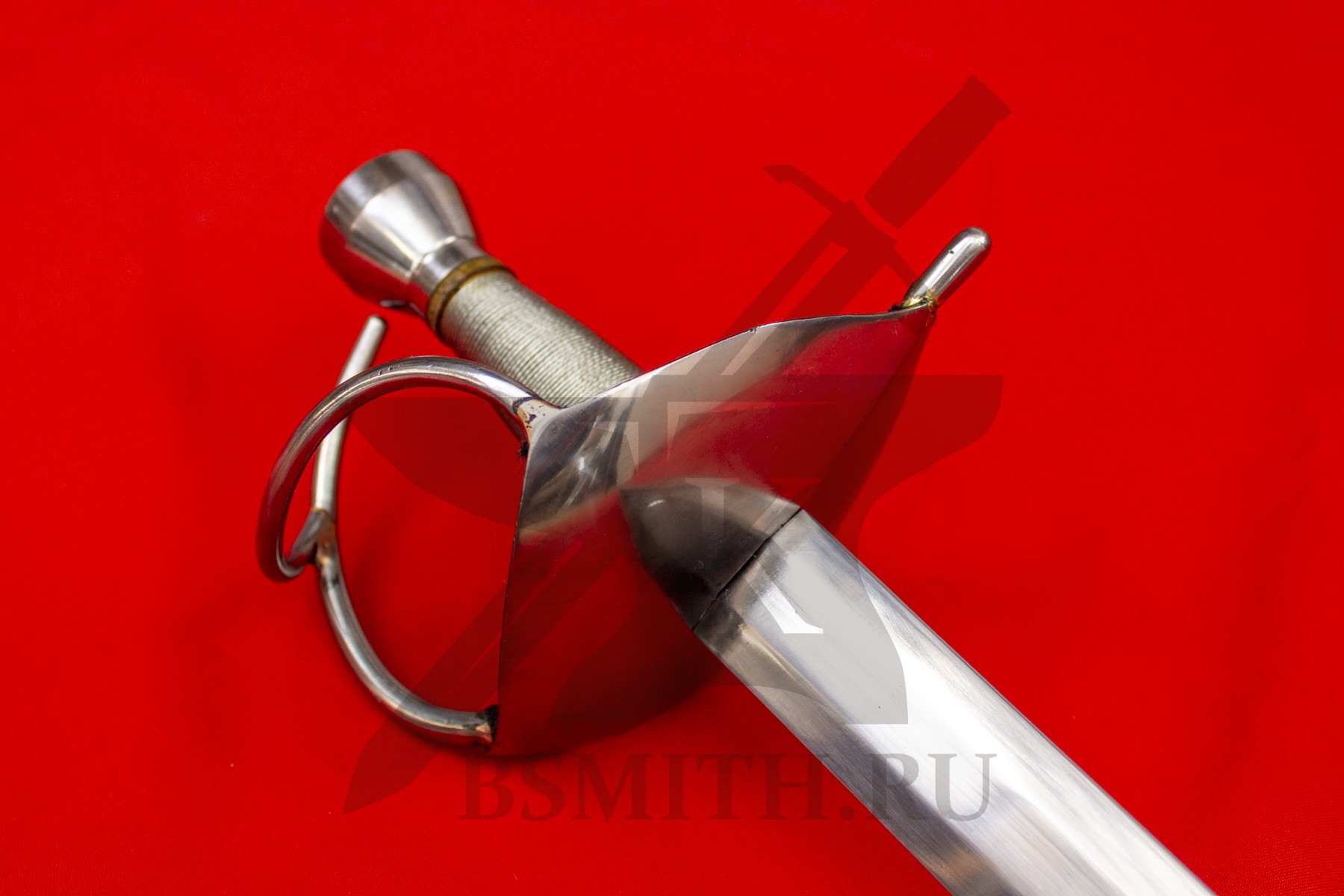 Клинок сделан из высокоуглеродистой легированной стали 65Г, с закалкой около 50 HRC, полированный. Клинок затуплен (отличие от холодного оружия), ослаблений никаких нет. Набор на эфес (навершие, гарда) стальной, пайка латунью (историчный вариант сборки - без сварки). Рукоять шпаги обмотана стальной проволокой.