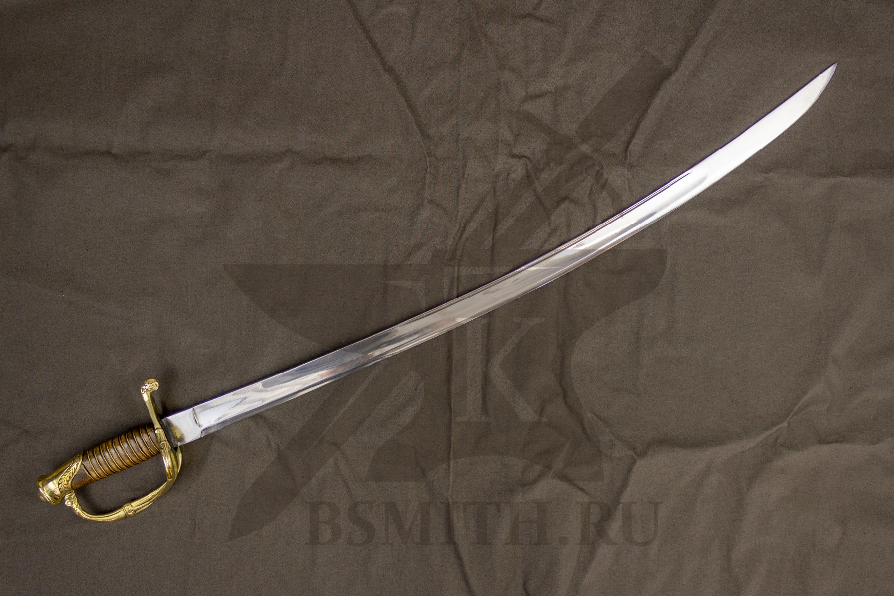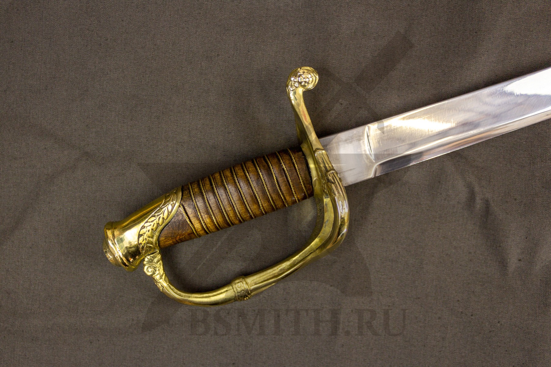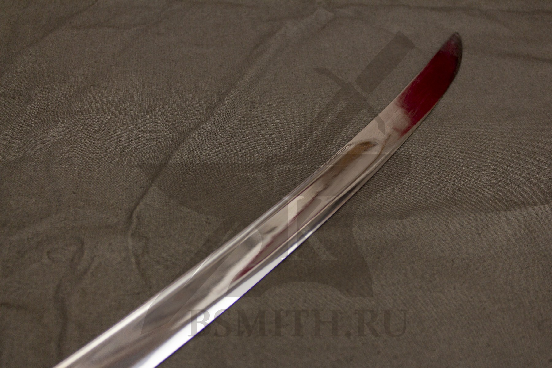 Клинок сделан из высокоуглеродистой легированной стали 60С2А, с закалкой около 45 HRC, полированный. Клинок затуплен (отличие от холодного оружия), ослаблений никаких нет. Набор на эфес литой латунный.
