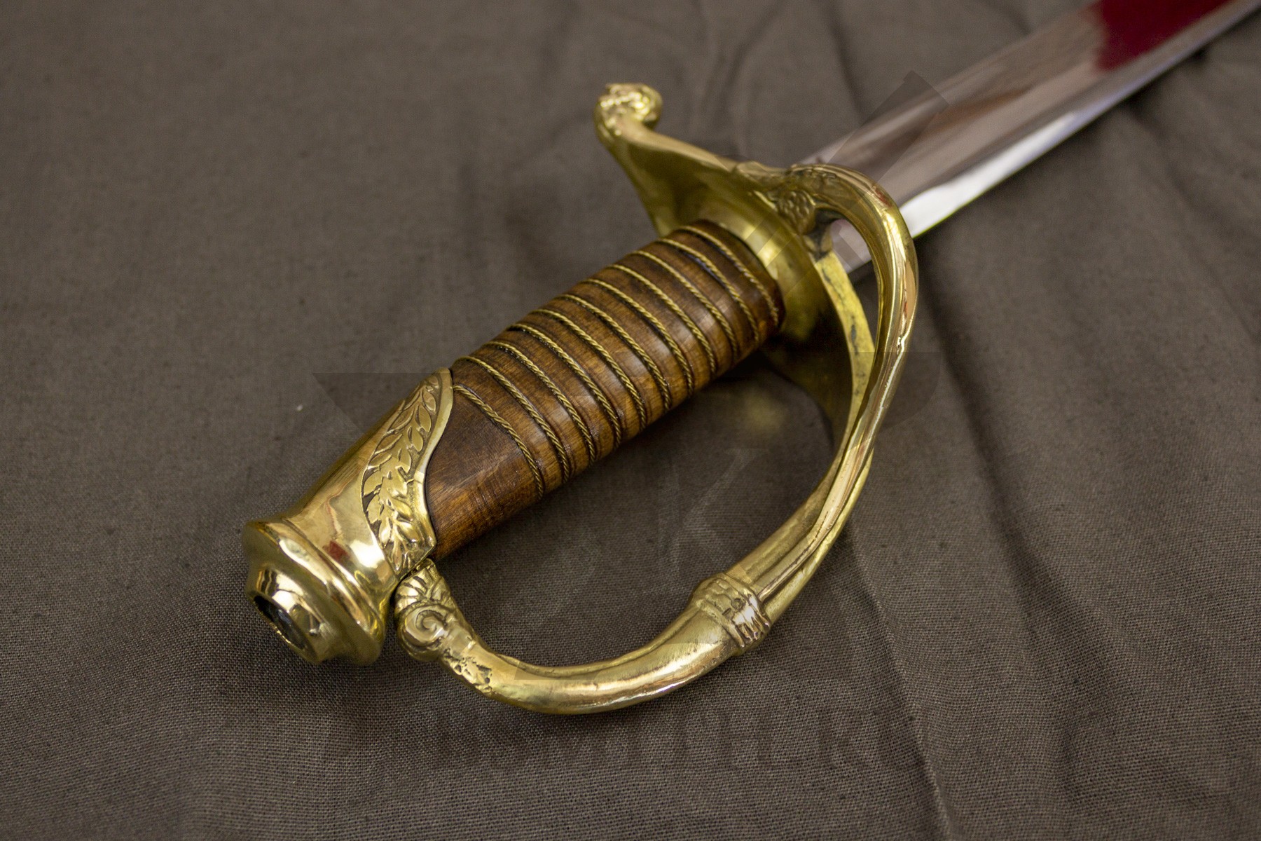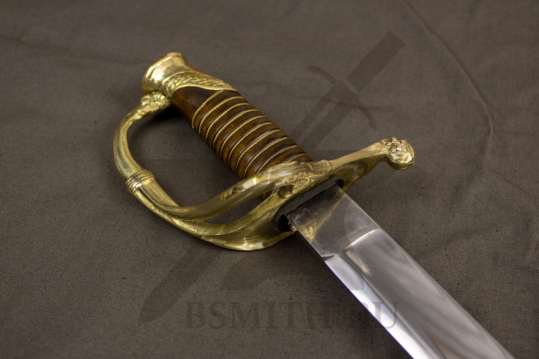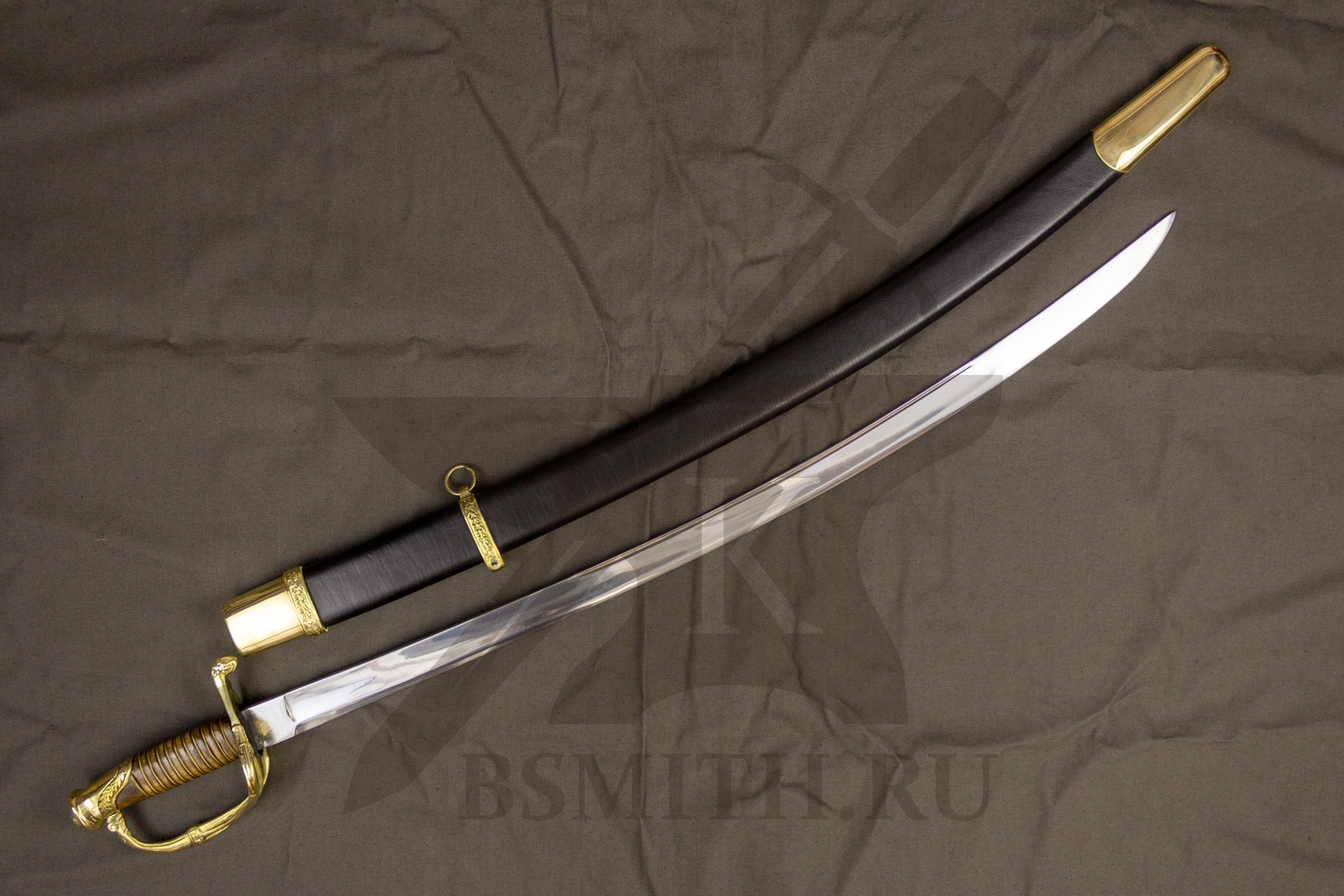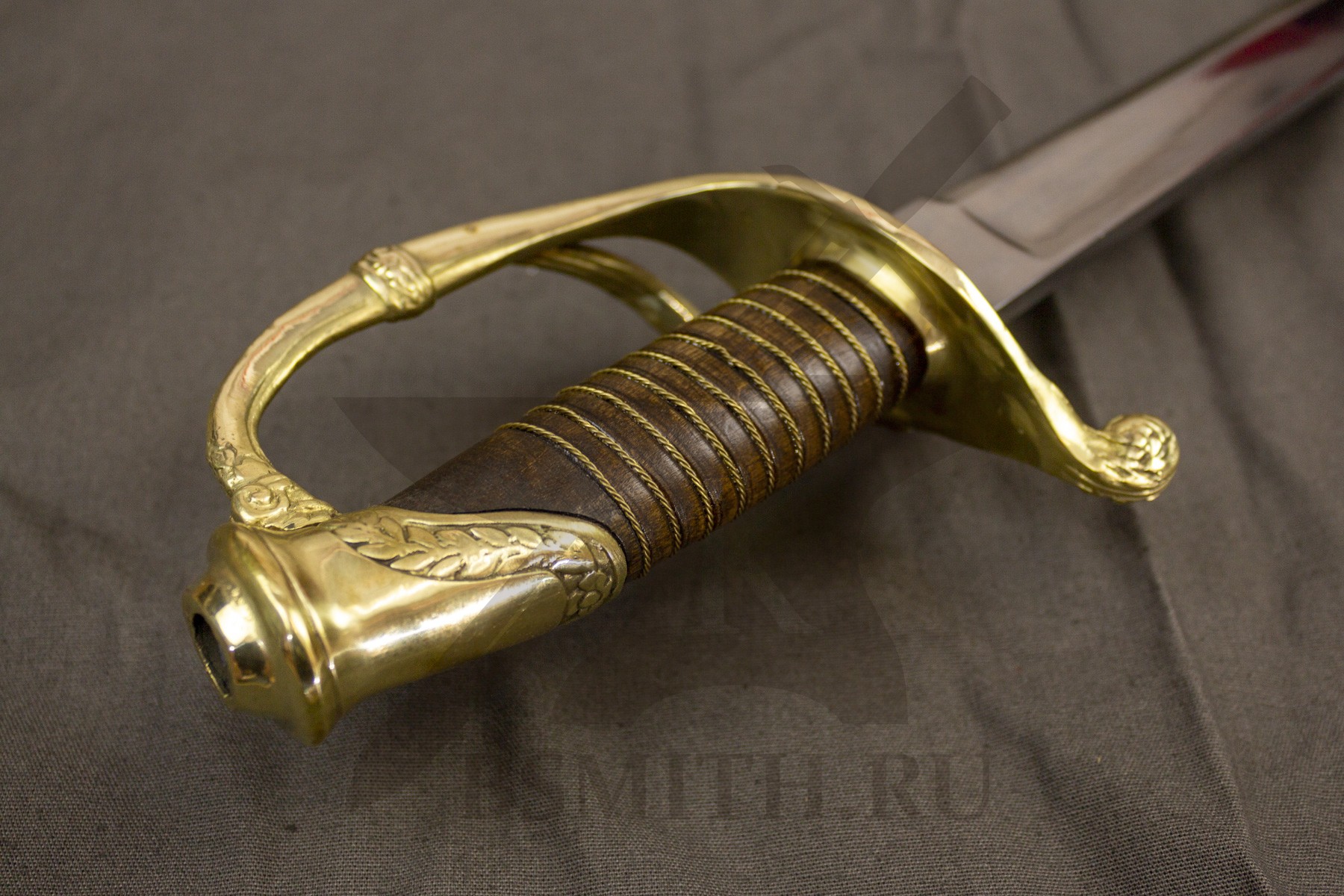 Клинок сделан из высокоуглеродистой легированной стали 60С2А, с закалкой около 45 HRC, полированный. Клинок затуплен (отличие от холодного оружия), ослаблений никаких нет. Набор на эфес литой латунный.