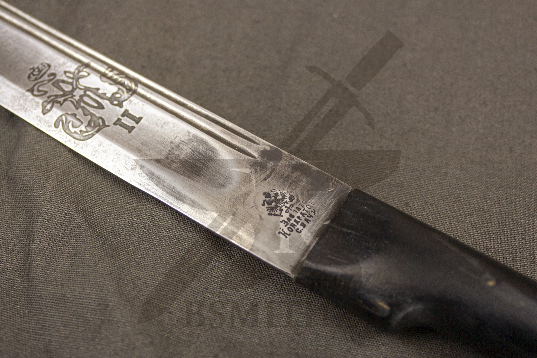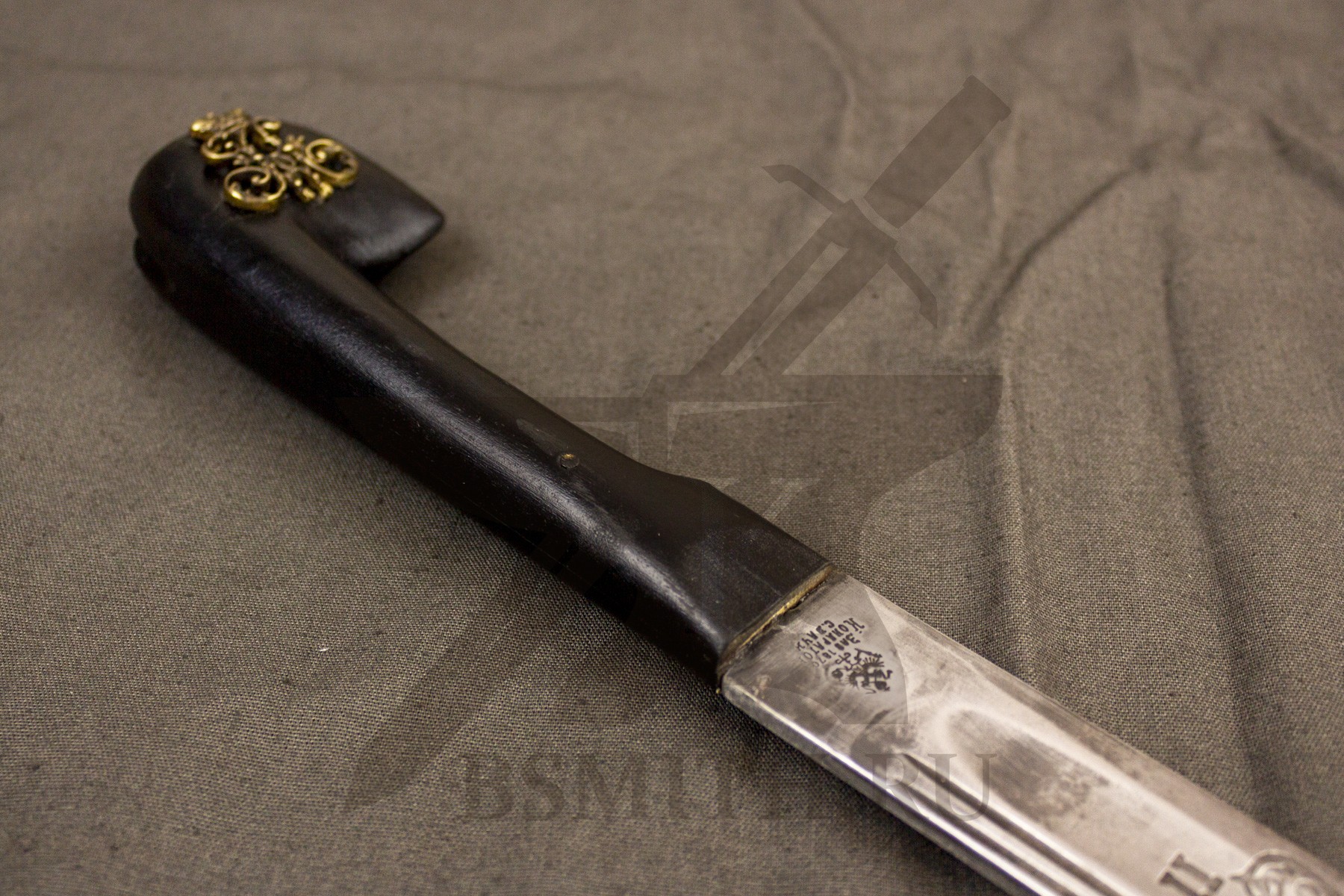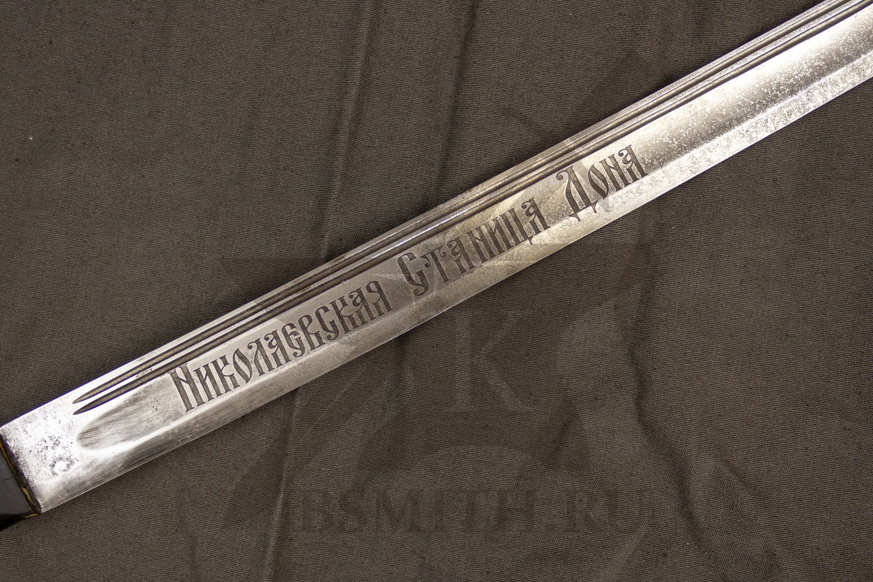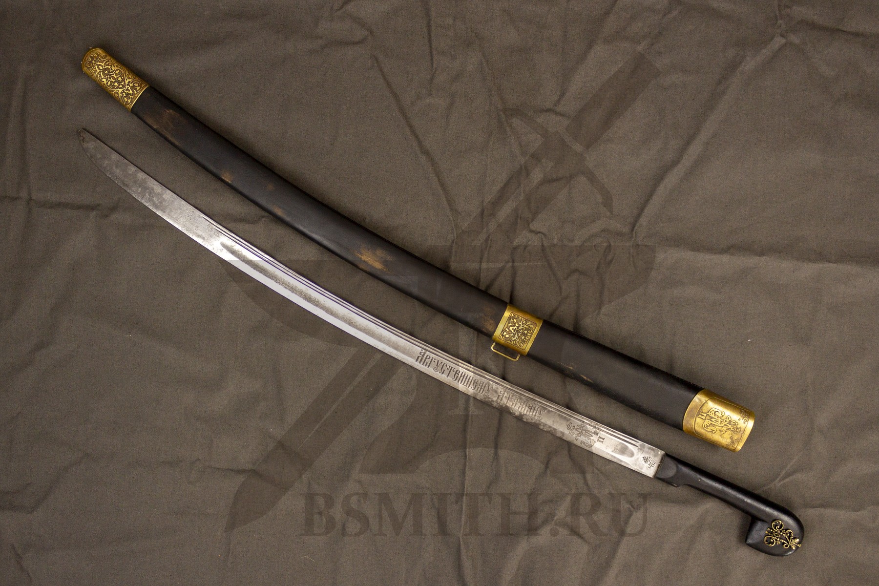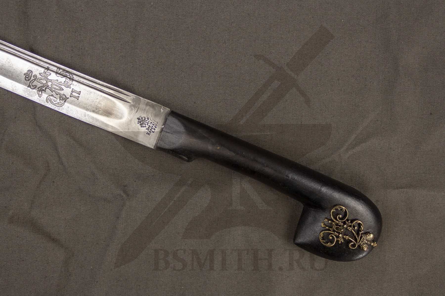 Шашка кавказского типа (погружная), с состаренными клинком, кожей ножен и металлическими частями набора эфеса и ножен, и нанесенными клеймами. Также шашка имеет украшения клинка травлением, и литой вензель Александра Второго на гуське рукояти.