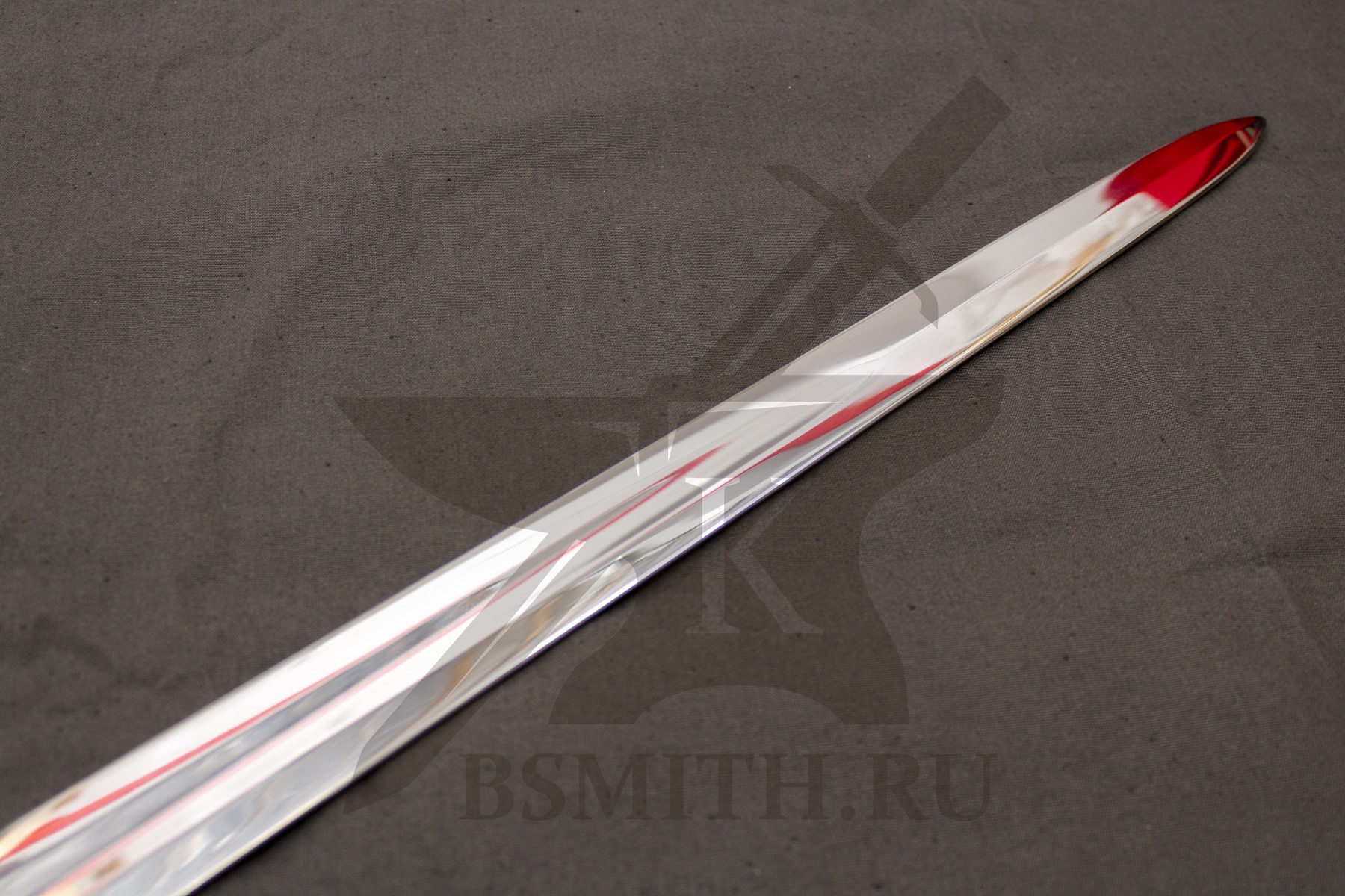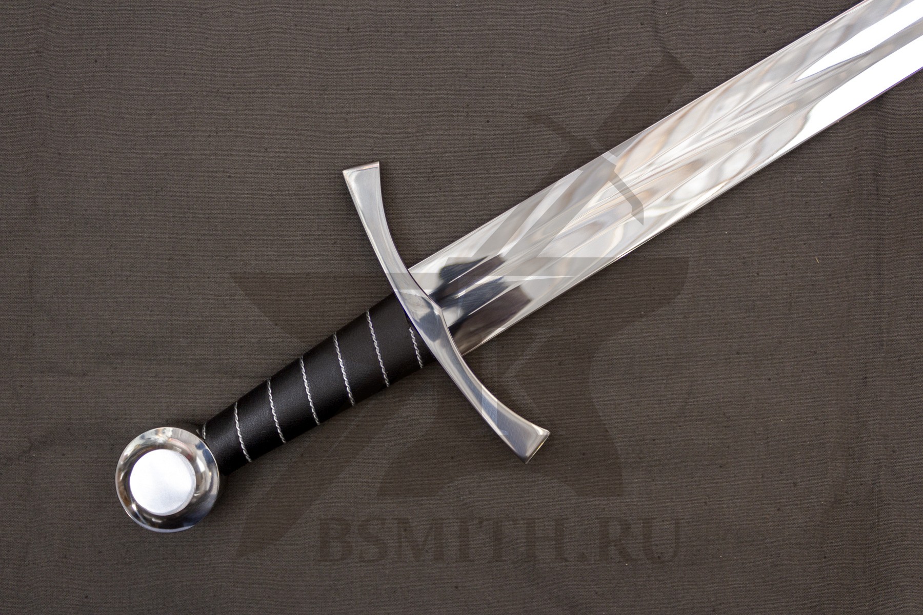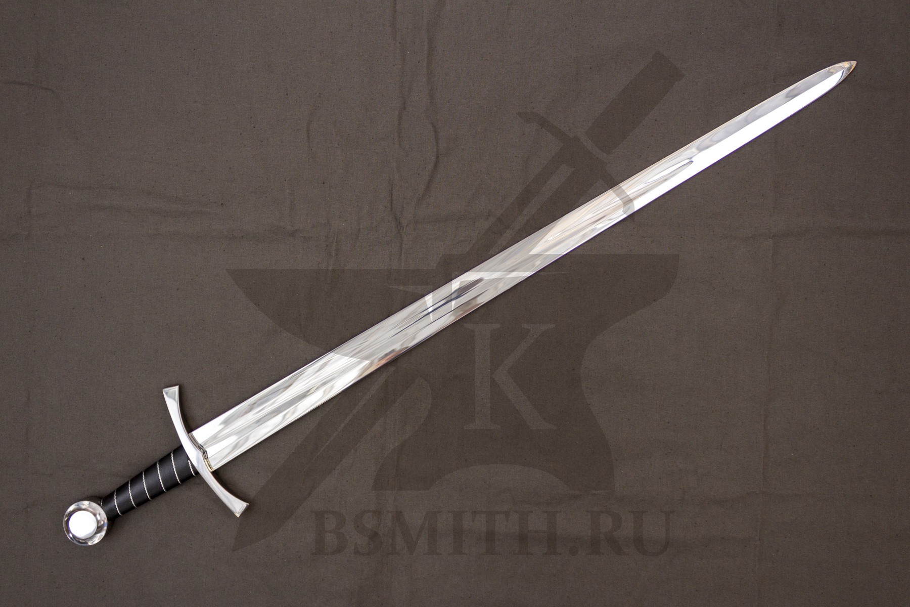 Клинок сделан из высокоуглеродистой легированной стали 65Г, с закалкой около 50 HRC, полированный. Клинок затуплен (отличие от холодного оружия), ослаблений никаких нет. Набор на эфес (навершие, гарда) стальной. Рукоять меча обмотана кожей, поверх имеет обмотку скрученной проволокой по шву кожи.